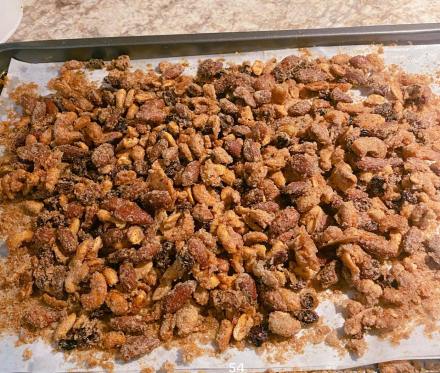 Pour the sugar mixture over the pecans and gently stir until everything is evenly covered. Spread the pecans out in a single layer on the prepared baking sheet.